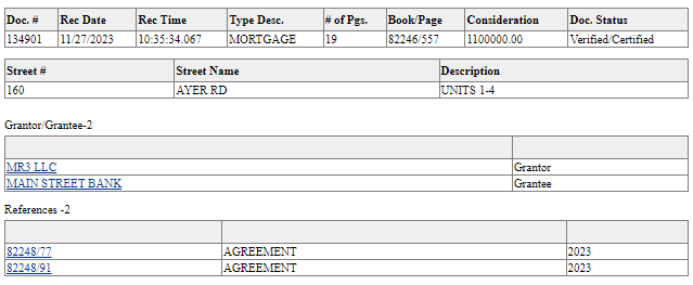 And twenty-five days after the Option expired, MR3 LLC—the entity that had purchased 160 Ayer Road a year earlier for $1,500,000.00 CASH—put the building up as collateral on the $1,100,000.00 MR3 got from Main Street Bank.