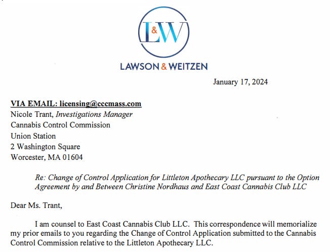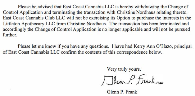 So, it’s safe to say that on August 8, 2022 that the November 3, 2021 Option Agreement—as a legally binding document—was still a legally binding document, one submitted by Matthew’s wife to the commonwealth’s licensing agency seeking permission to change the ownership and control of Littleton Apothecary, LLC from herself to East Coast Cannabis Club, LLC.
