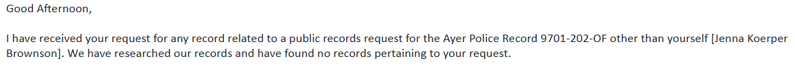 The next day, Littleton’s town clerk informed me that there were no records “responsive to this request,” that is, no records exist because back in 2014 no one in those positions of power in Littleton asked Ayer for the police report of King’s 1997 rape.