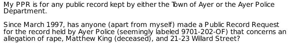 Since 1997, no one except me has ever asked Ayer Police Department for the King rape report.