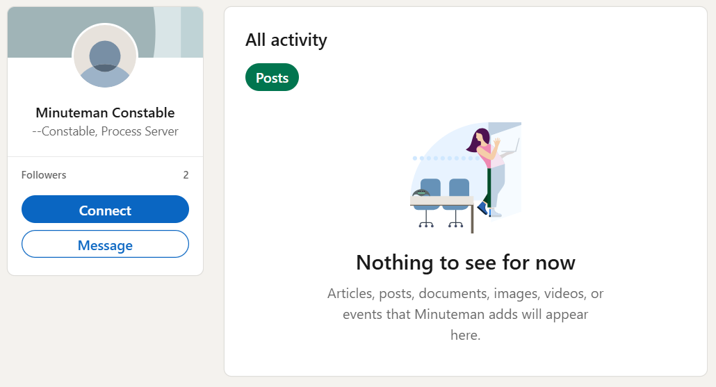 Minuteman Constable Services, LLC has no webpage, though it does have a LinkedIn account where the LLC’s activity is non-existent: