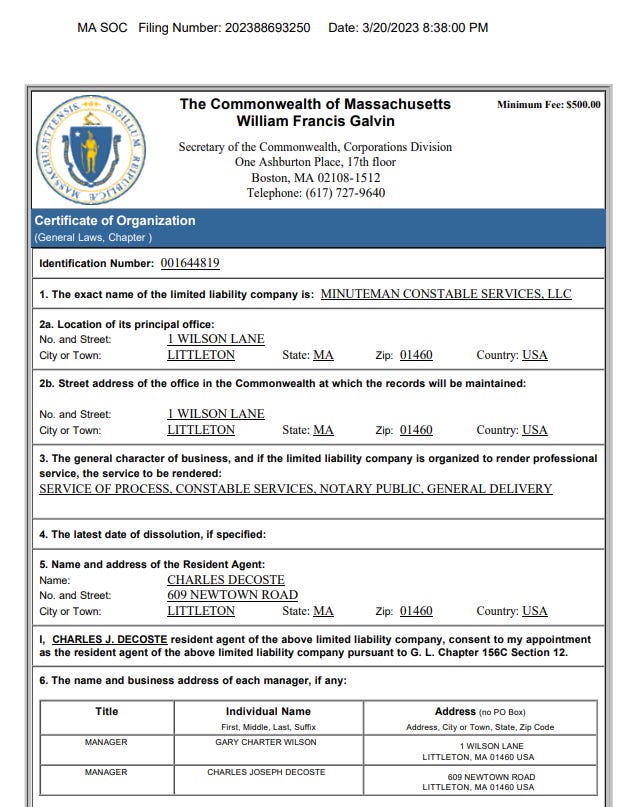 Gary Wilson and Chuck Decoste, the co-managers of Minuteman Constable Services, LLC, are, today, two of the five current members of Littleton’s Select Board.