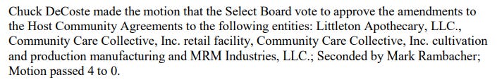One week after Wilson’s and Decoste’s LLC was organized as a business entity, the Littleton Select Board took up the postponed agenda item relative to Cannabis Host Community Agreements. The minutes from that March 27, 2023 meeting are: