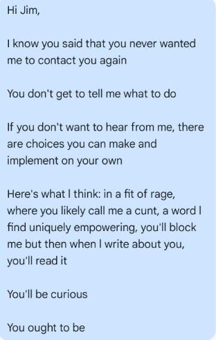 On August 7, 2024, I published “Is this Weird, Littleton?” and texted the link to Karr. He replied a few weeks later, commanding that I never contact him again.