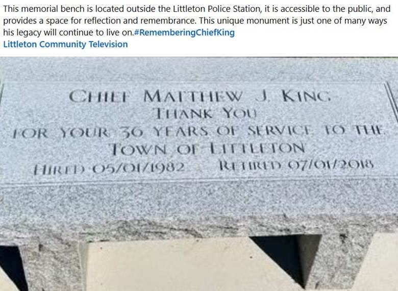 G. Order the removal of the King memorial bench from Littleton town property, i.e., from where it was installed outside the front door of Littleton Police Department; and