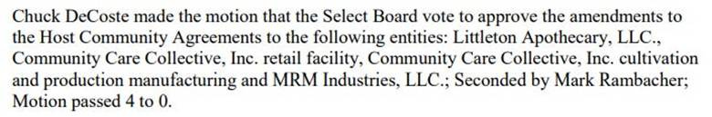 - On July 24, 2023, Plaintiff began writing at her Substack and on her blog about the history and present status of the cannabis industry in Littleton and its intersection with Littleton’s Select Board, the governing body with exclusive authority to grant the Host Community Agreements (HCA) that allow various cannabis entities to operate in Littleton.