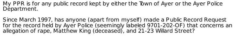 - Leslie alleged the digital rape occurred in the neighboring town of Ayer, in a duplex owned by King.